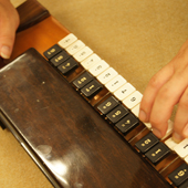 数字の譜が書かれたキーを押しながら弦を弾くだけで、簡単に演奏をすることができる楽器です。楽譜が読めなくても、初日から曲が弾けます。